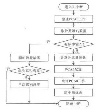 T0被设置为脉冲下降沿计数模式,以对流量脉冲信号进行计数,16位定时器T3用于设置查询周期。一旦查询周期到达,系统将响应中断并读取T3中断内的T0计数值,从而计算瞬时流量、单个累积流量和总累积流量。