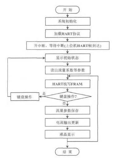 该测量系统的软件开发平台采用KeiluVision3,编程采用C语言。单片机上电后,首先执行初始化,加载并中断HART协议,等待上位机的HART帧到达,读取铁电存储器的数据,按键执行键盘操作;如果没有按键,总累计流量、瞬时流量、单次累计流量和温度的显示将定期刷新。