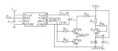 由于用户通常提供DC12 V或DC24 V电源,稳压器Z1用于稳定5 V电压,以便向光耦合器的另一端供电。脉冲输出电路如图3所示。在图3中,VW+和VW-是用户提供的外部DC12 V或DC24 V电源输入端,Q1和Q2是三端。在脉冲输出过程中,当P1.4和P_OUT处于高电平时,Q1导通,Q2截止,节点脉冲输出处于高电平。当P1.4和P_OUT为低电平时,Q1关闭,Q2开启,节点脉冲输出为低电平。